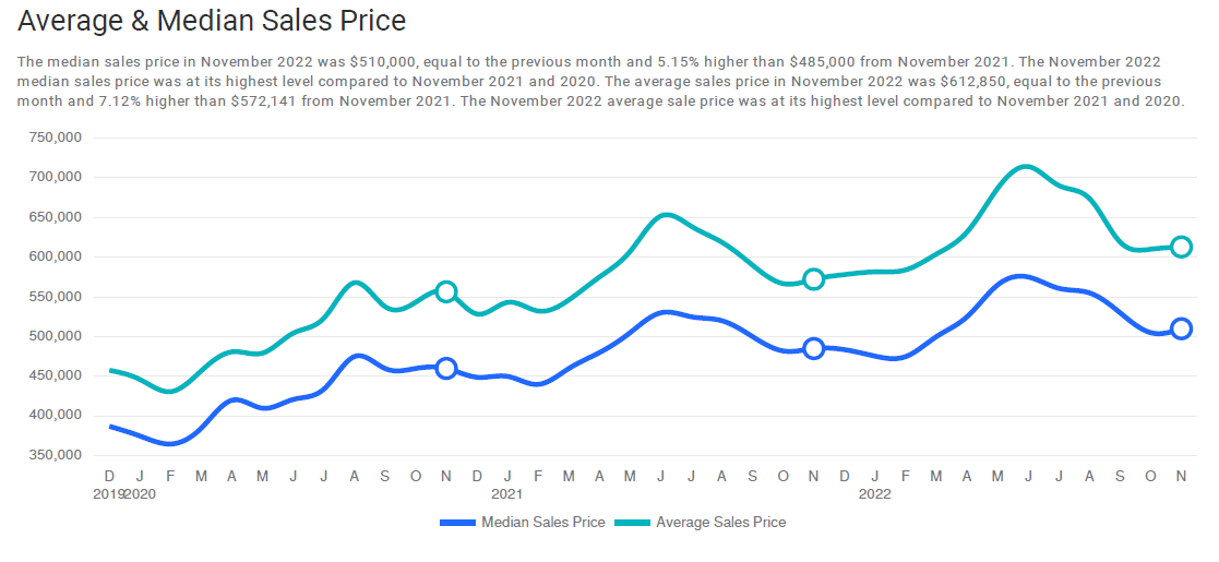 成交量的下降除了库存因素,季节因素也很明显,毕竟房地产市场是一个非常有季节性的市场,通常都是春夏无论看房还是成交数量都是全年最高的,冬季则是明显的淡季。但对于无论是卖家还是买家来说,淡季也意味着更少的竞争压力。那么房价有没有发生明显的变化呢?表面上看,似乎11月份的房价开始低于10月份,而10月份又低于9月份,但这只是季节性的变化,从下面这张房价的变化图,就可以看出,如果以年为单位的话,过去三年泽西的房价在不断攀升,2022年11月的平均房价还是明显高过2021年11月;这张图不仅仅代表了房价按月同比的增长,也明显体现出房价变化的季节性。