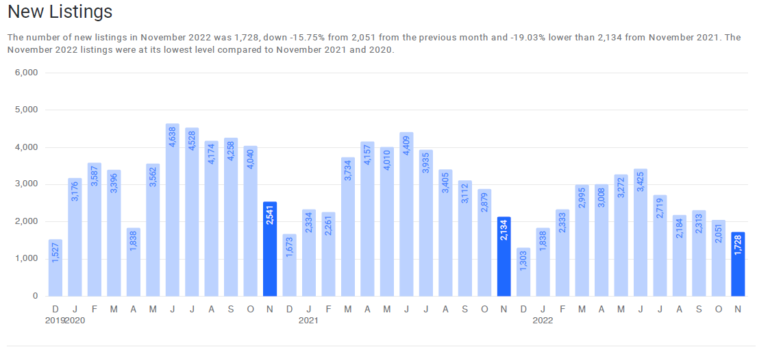 目前的状况是购房者数量少,同时供应量更少;而进入2023年,供求双方会如何变化还是比较难判断的,不过随着时间的推移,我们依然可以从这个曲线的变化来做参考。但就目前而言,市场房屋的供应量已经降到过去三年的最低点(参考下图,请注意是按照年度对应的月份来比较,也就是2022年跟前两年比,同比新上市房屋数量达到最低),因此可以预期的是卖方市场还会持续一段时间。